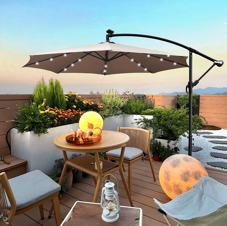 [Energy-Efficient Lighting]: The patio umbrella has 24 solar-powered LED lights that will light up your terrace when night falls. Soft lighting creates a romantic atmosphere for you. All LED bulbs are powered by solar panels at the top to save energy while maintaining perfect lighting.