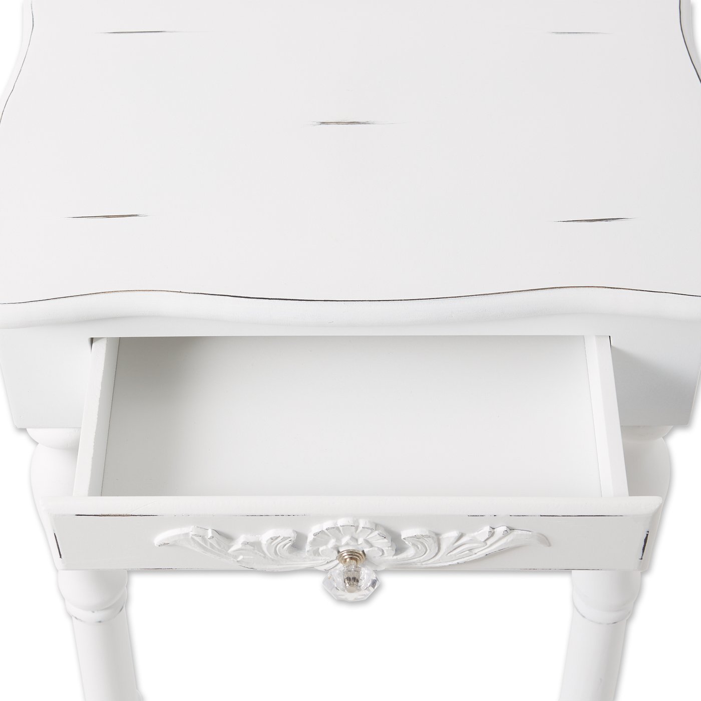 • Shaped legs and shell-design trim add distinction to this decorative side table perfect for any space in your home. A generous drawer and a bottom shelf also provide plentiful storage.