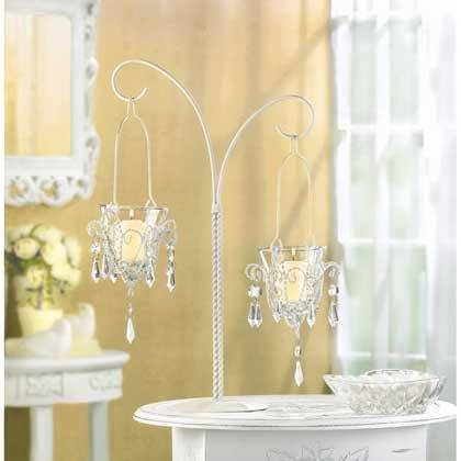 • Uniquely beautiful tabletop stand boasts two miniature hanging votive chandeliers featuring silver swirls and glittering crystals. The epitome of modern elegance, this lighting décor will look amazing anywhere you put it!