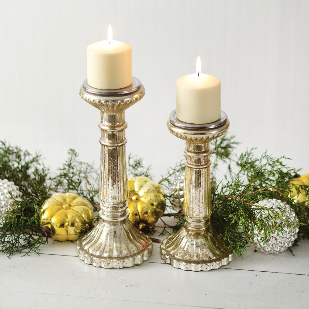Set of Two Mercury Glass Pillar Candle Holders