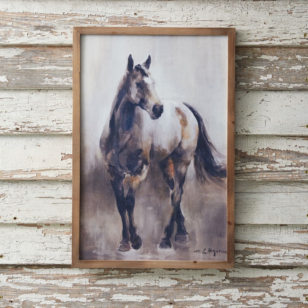This horse wall art is a framed canvas print. It would add a nice touch to country and western decor. It is hung with a nail by its two sawtooth hangers.